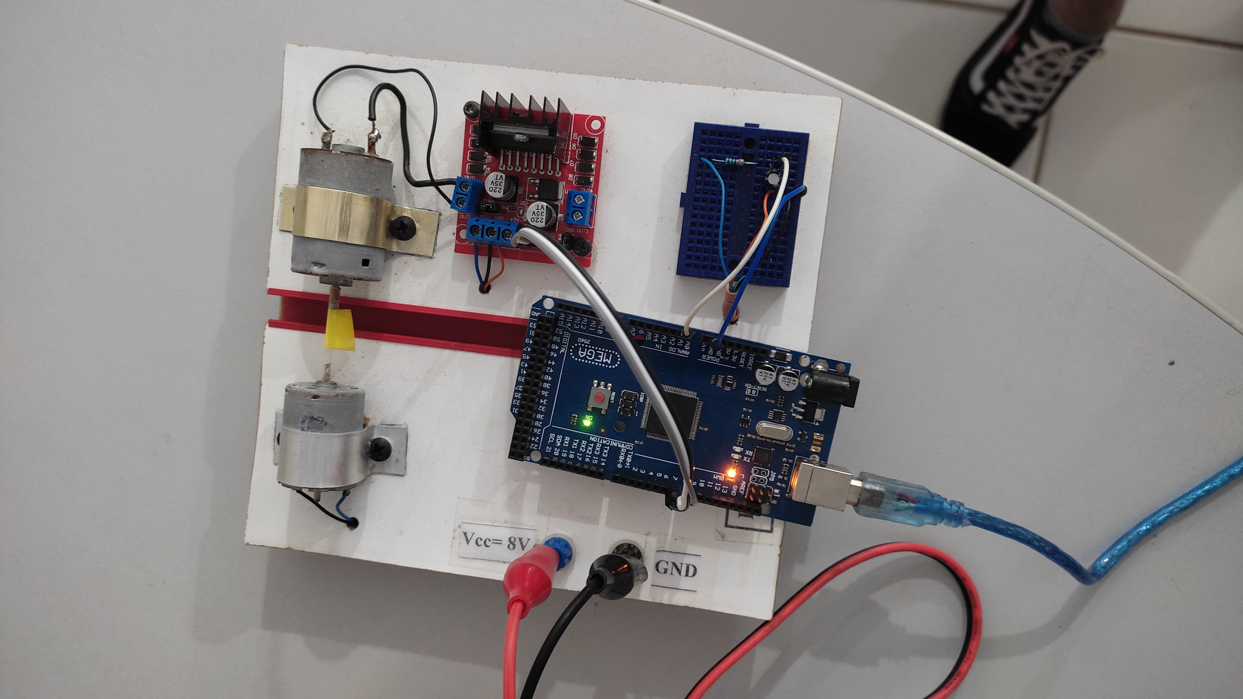 A bancada em si era composta por diversos componentes eletrônicos, todos interconectados e controlados pelo Arduino. A imagem abaixo mostra a configuração da bancada durante a apresentação.