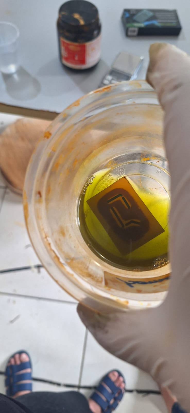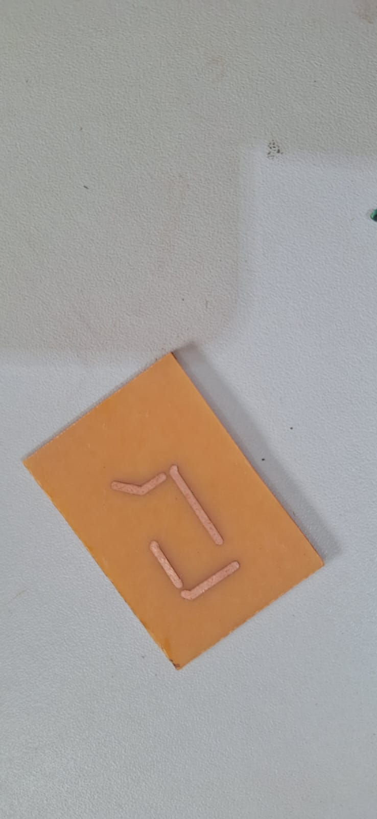 Utilizei a máquina a laser para cortar a máscara adesiva de acordo com o design do circuito. A máscara foi então aplicada sobre a placa de fenolite, cobrindo as trilhas e expondo as áreas a serem corroídas. Submergi a placa na solução de hipercloreto, monitorando continuamente o progresso da corrosão.
