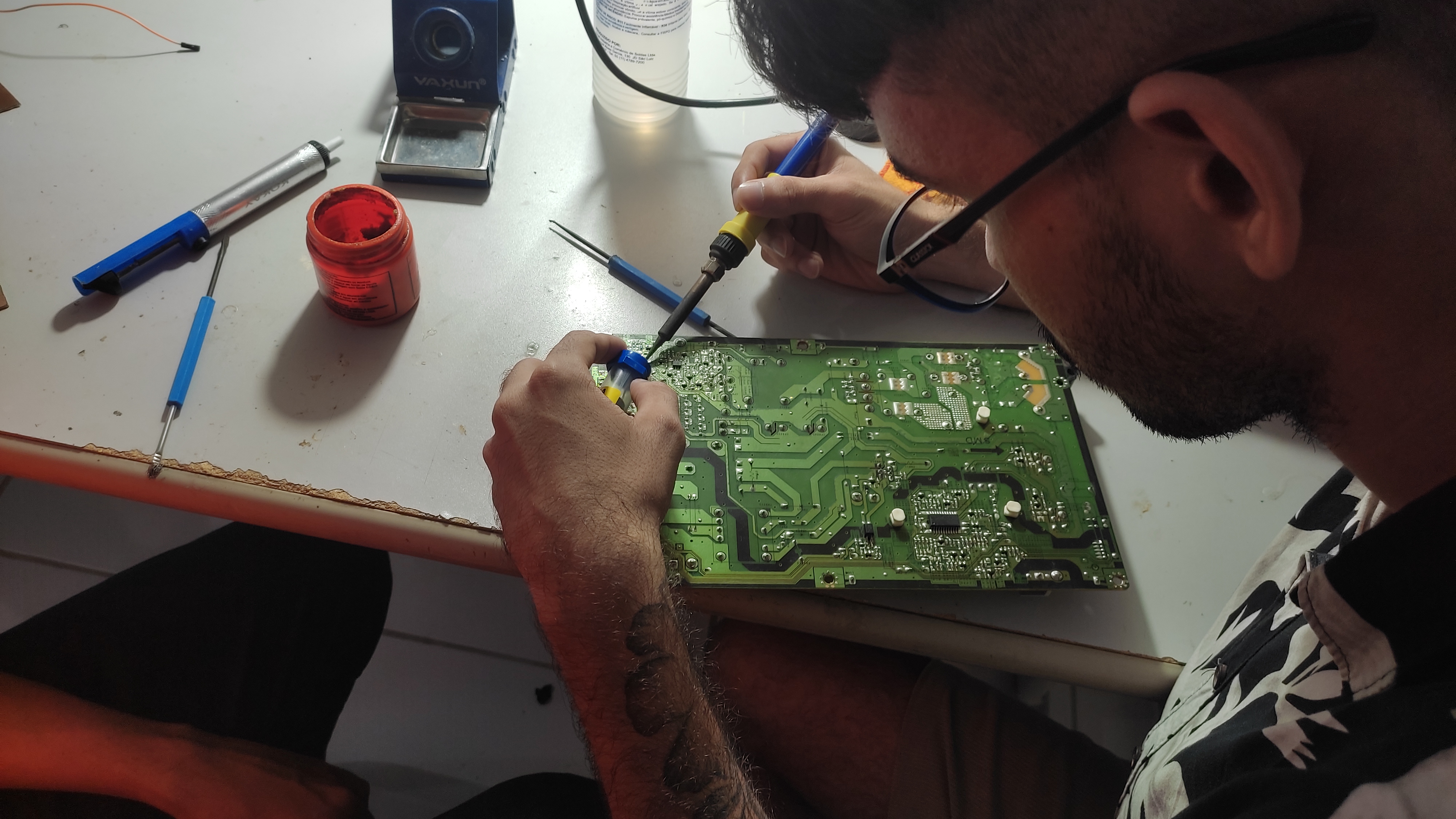 Durante o treinamento, tive a oportunidade de praticar soldagem, o que incluiu aprender a técnica de soldar componentes em uma placa de circuito impresso e também a habilidade de remover componentes danificados ou defeituosos da placa.