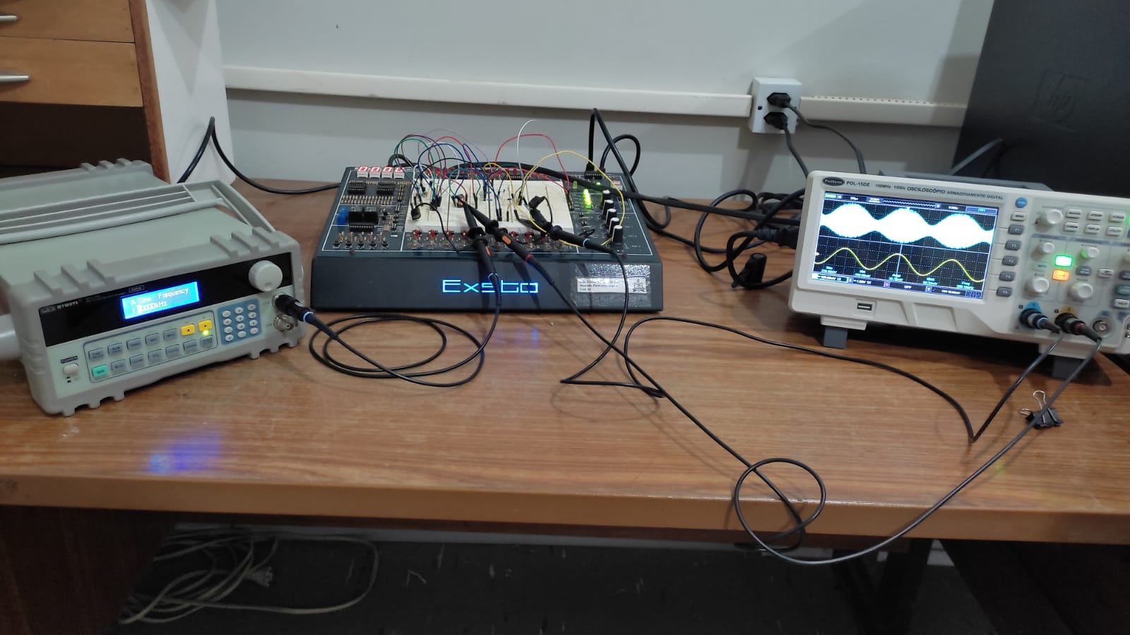 Com a simulação validada, a próxima etapa foi montar o circuito em uma protoboard. Esta etapa permitiu testar o circuito fisicamente e garantir que os resultados simulados correspondiam aos resultados práticos.