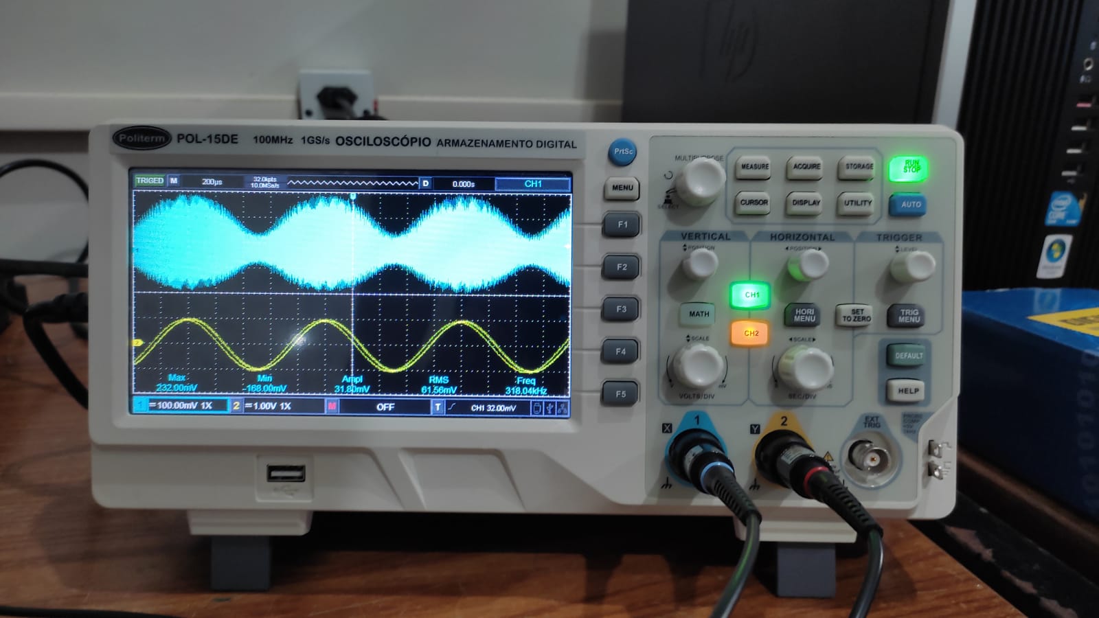 A visualização no osciloscópio foi fundamental para confirmar a qualidade do sinal modulado. Ajustes finos foram feitos para otimizar o desempenho do transmissor e garantir que o sinal de saída fosse uma representação fiel do sinal de entrada modulado pela portadora.
