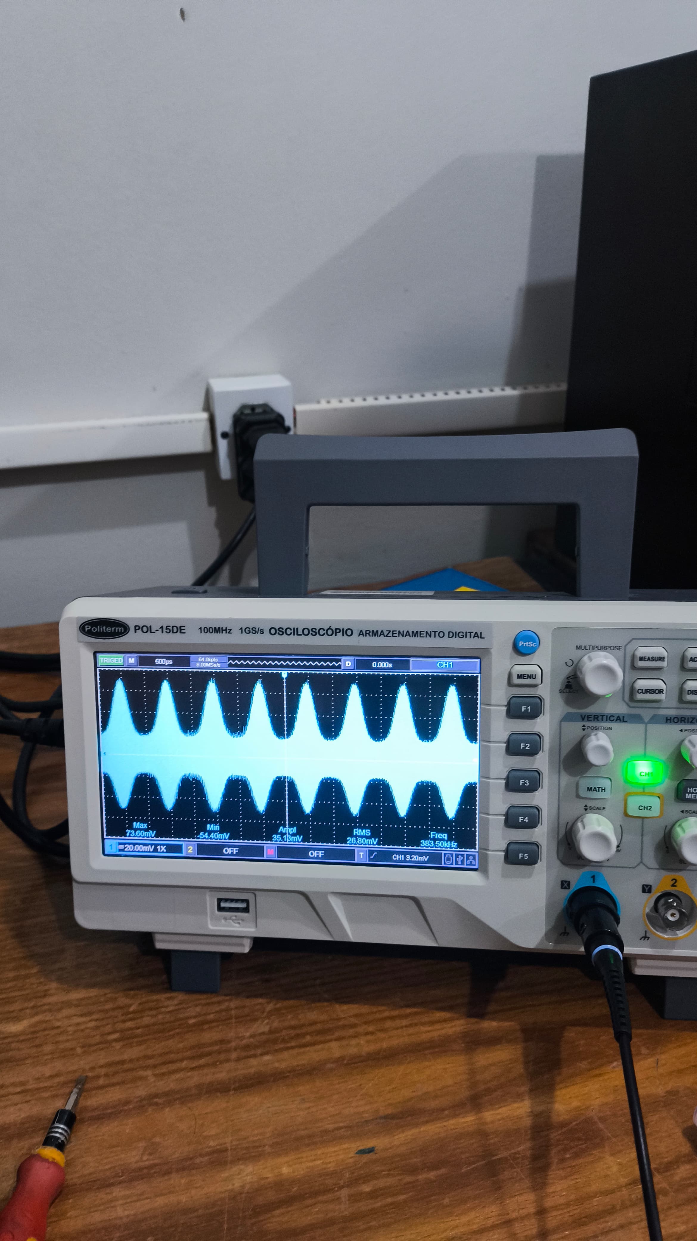 Após a montagem dos componentes na PCB, foi realizada uma série de testes finais para verificar o funcionamento do transmissor AM. Utilizando um osciloscópio, monitorei o sinal de saída para assegurar que a modulação de amplitude estivesse sendo realizada corretamente e que o transmissor operasse conforme esperado.