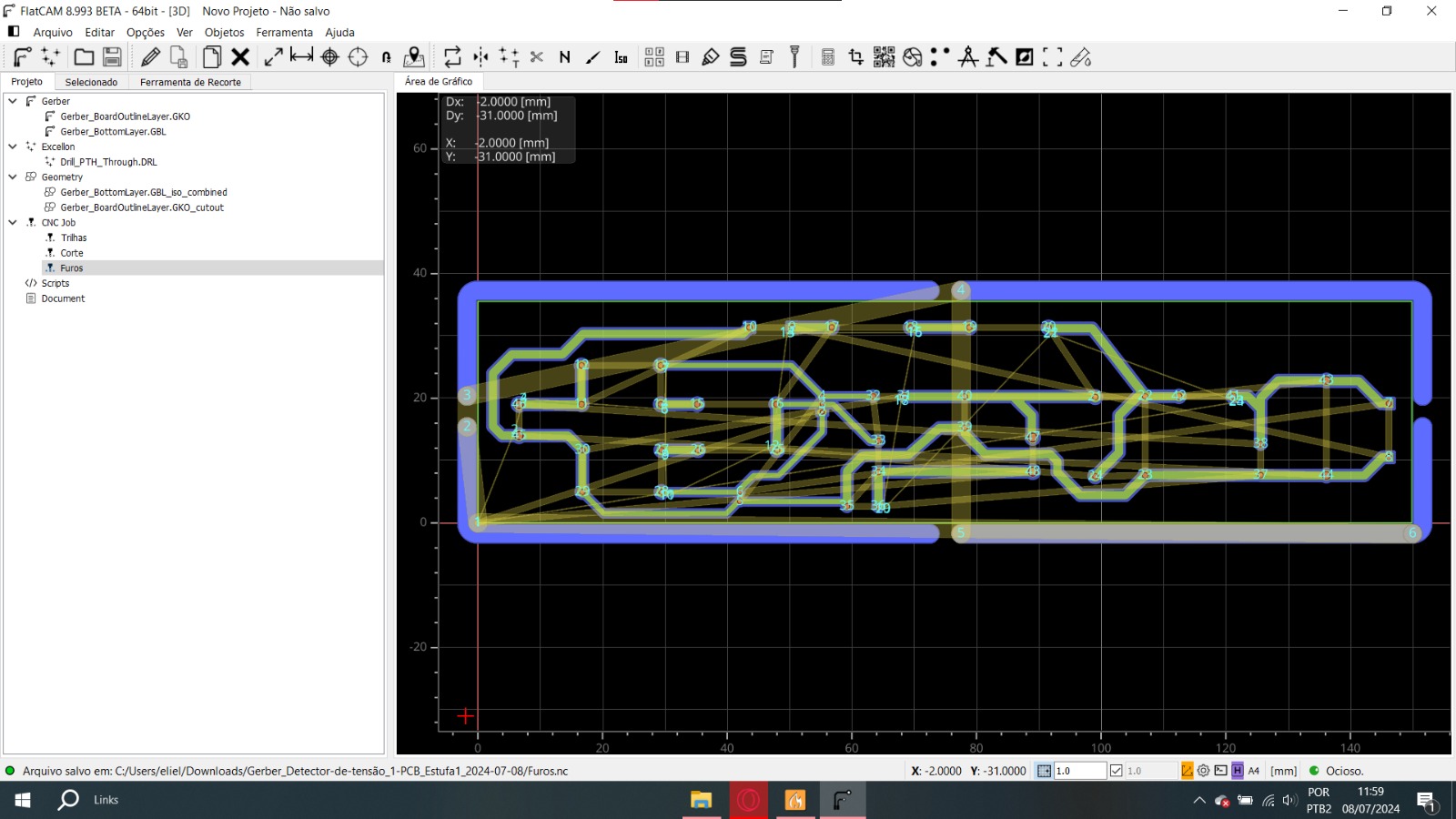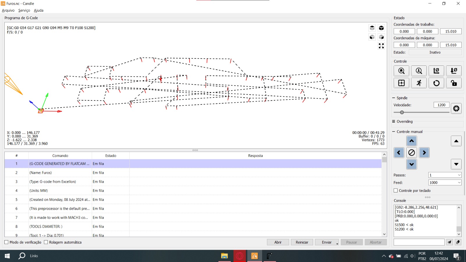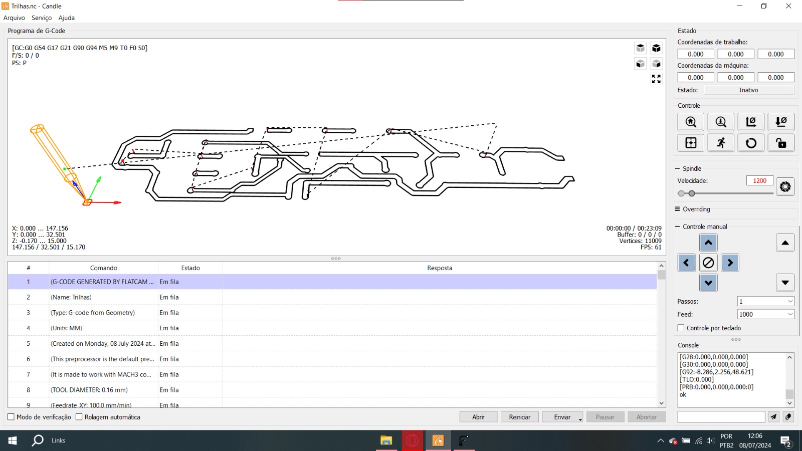 O primeiro passo foi carregar o arquivo de trilhas da PCB no software Candle, utilizado para controlar a fresadora. Verifiquei se as dimensões da placa estavam de acordo com as do material a ser utilizado.